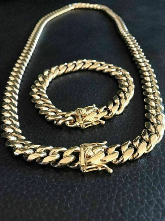 12mm Mens Miami Cuban Link Bracelet & Chain Set 14k Gold Over Stainless Steel
